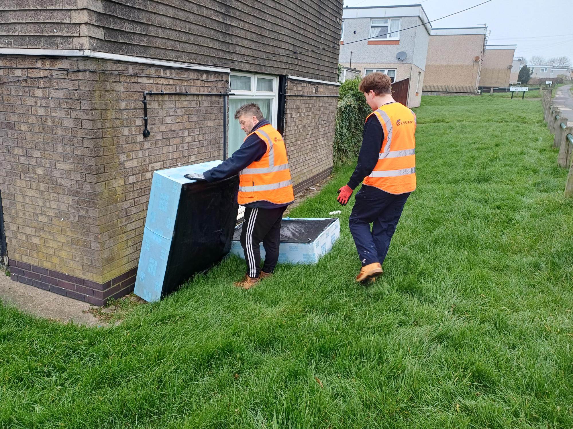 On Friday 20th March 2026, we partnered with Equans to deliver an Eco project tackling the fly-tipping problem head-on. Over six hours, we collected litter and bulky waste from across the estate; old bed bases, scooters, highchairs, carpet off-cuts and general household items; disposing of everything using two eight-yard skips we provided free of charge. Leeds City Council also supported the effort by sending a street sweeper to follow the team and collect finer debris along the way.